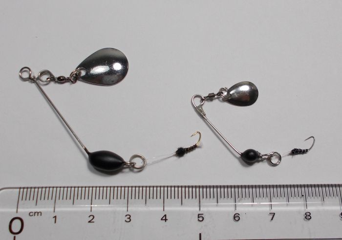 「川魚ミッジ・スピナーベイト」を製作しました。 これまでに「川魚マイクロスピナーベイト・フライ」というルアーを製作していたのですが、 このルアーをもってしても攻略できない川魚たちがいました。 「川魚マイクロスピナーベイト・フライ」に反応しなければ あきらめもつくのですが、 興味をもって追いかけてきているにもかかわらず、 「あと一歩」というところ帰っていく魚たちを 何とか食わせられないか? と試行錯誤を重ねてきました。 サイズを小さくすれば ということはすぐに思いつくのですが、 サイズを小さくしただけでは、 ルアーとして満足できる動きが出ませんでした。 パーツ選びやワイヤーの寸法を試行錯誤した結果 完成したのがこの形です。 川魚マイクロスピナーベイトとの比較。 サイズだけでなく、ワイヤ―の加工にも工夫しました。 ただし、 ブレードの取り付けを極限にまで小さくしたため、 ラインを結ぶ際には、ブレードの位置にしていただきたいのです。 こちらはあまりよくない結び位置です。 こちらに結んでもブレードは回転しますが、 本来の機能を発揮しずらくなってしまいます。 いろいろとテストして、納得がいかず、という トライ・アンド・エラーを幾度も重ねていくうちに、 販売できるのがシーズンがほぼ終了した12月になってしました。 写真のヌマムツは11月30日、水温がほぼ10度という 小型の川魚にとっては冬支度を始める頃に釣りました。 マイクロスピナーベイトやスプーンには興味を示しても 口を使うことはないという限界の状況。 そんな中、 川魚ミッジ・スピナーベイトにだけ追っかけてきて 口を使ってくれました。 この日はヌマムツだけでなく、 カワムツはもちろん、オイカワやタモロコも釣れました。 この結果をもってようやく販売させていただくことにしました。 |